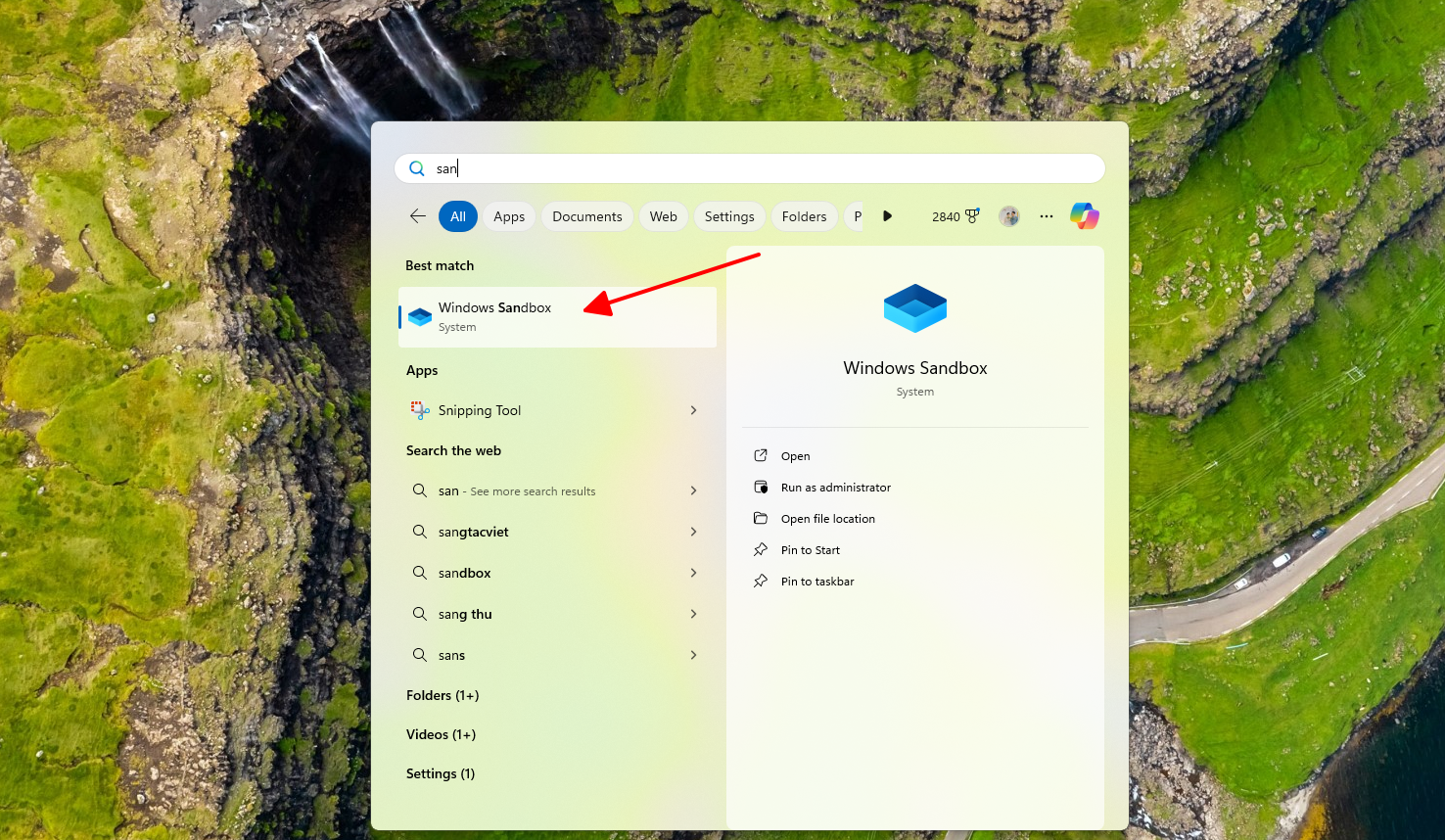 Nhấn Windows + S > Gõ Windows Sandbox > Nhấn vào Windows Sandbox để mở.